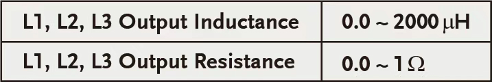 ASR-6000 系列具備輸出阻抗調(diào)整功能,主要應(yīng)用為改變各相的輸出電感值與輸出阻抗值,用以模擬各相因線(xiàn)損導(dǎo)致輸出電壓下降的狀況。ASR-6000系列輸出阻抗可調(diào)整范圍如表: