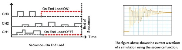 右上圖是一張單通道交換式電源供應器仿真負載快速變化的一個范例。透過數(shù)字示波器搭配使用電流測棒所截取到的電流波形,PEL- 2000A可程序直流電子負載的序列編程功能,能夠對于交換式電源供應器進行產(chǎn)品的性能測試