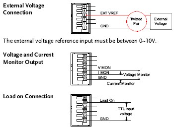 透過后面板對應通道的6針插槽,可監(jiān)測每個通道的輸入狀況,包括輸入電壓、輸入電流、負載的On/Off,以及CC與CV模式的設定。電壓監(jiān)測輸出,(VMON) 與電流監(jiān)測輸出 (IMON),所輸出的負載輸入電壓和負載輸入電流是其所占全刻度的百分比,如0V=0%全刻度輸入電壓,10V=100%全刻度輸入電壓。電壓監(jiān)測透過1 & 3 電流監(jiān)測透過1 & 2。下面描述了電壓和電流監(jiān)測輸出的接腳配置。