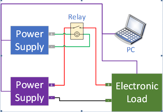 多組繼電器測試的設(shè)備連接方式如下圖表示,其中控制不同繼電器的電源可使用多通道電源設(shè)備來控制。