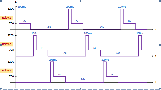 電動車?yán)^電器組件的拉載電流時序可簡化模擬成以下時序圖
