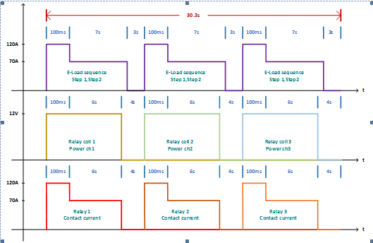 當(dāng)所有設(shè)備連接完成,并搭配計算機端的軟件控制,控制繼電器的通道、拉載電流等等…即可達到多組的測試需求,其實際動作波形可由下圖表示:
