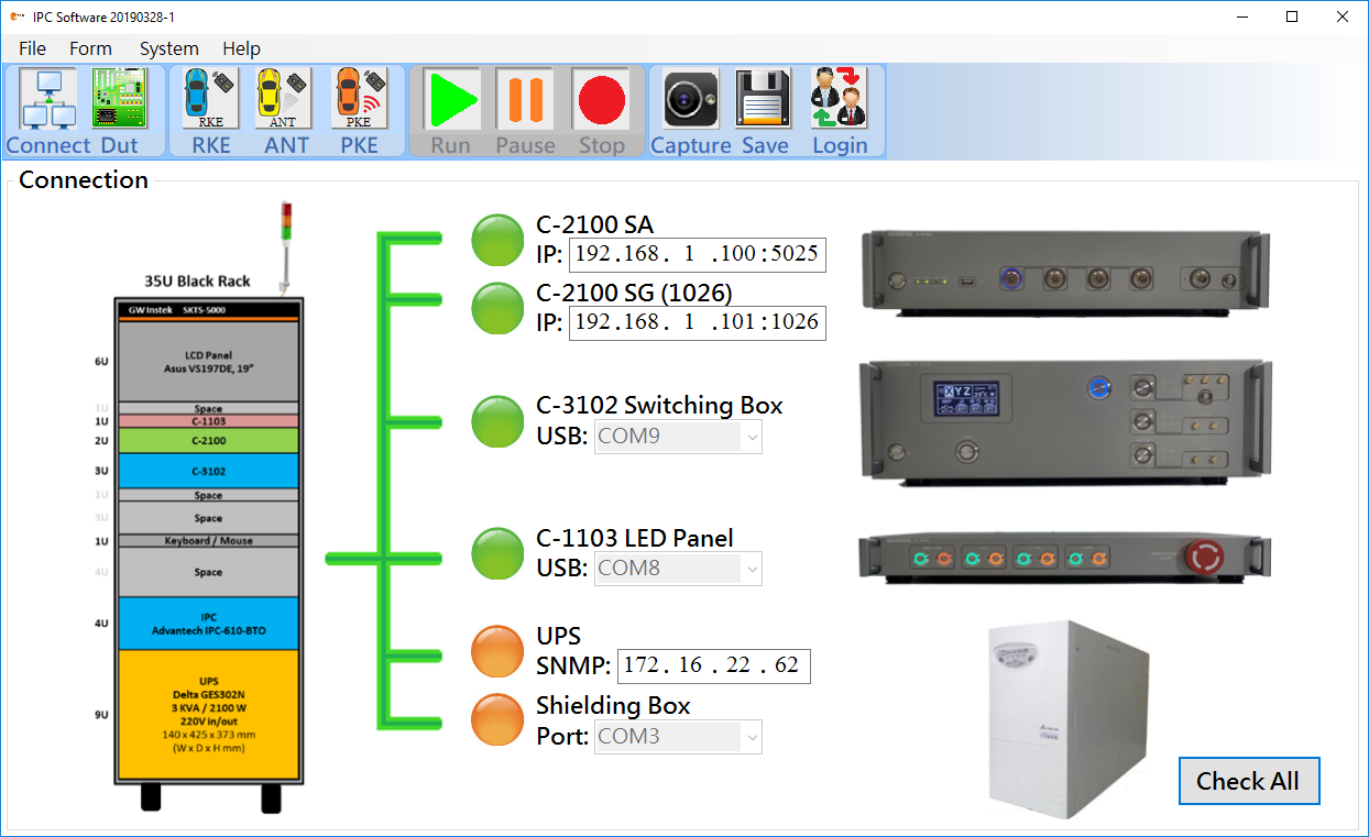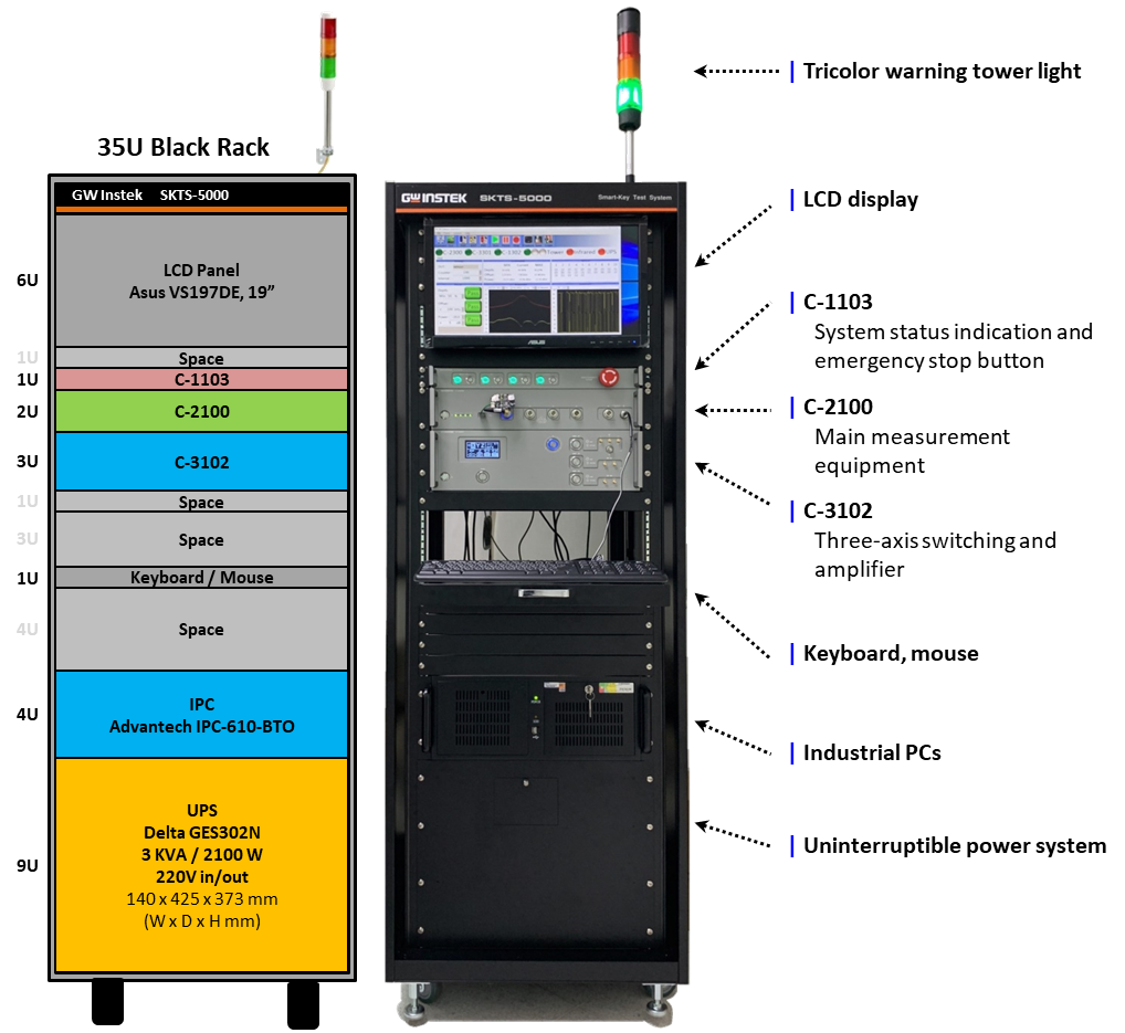 在信號(hào)輸出入部分,SKTS-5000提供四通道RF輸入、一組RF 315/433MHz輸出、與一組LF信號(hào)輸出;其中在LF輸出信號(hào)可支持10Hz ~ 10MHz的頻率范圍與電壓可調(diào)的功能,便于進(jìn)行各種的Smart Key測(cè)試。透過三軸開關(guān)和放大器模塊,可用來仿真車機(jī)與待測(cè)物之間的距離。而系統(tǒng)狀態(tài)指示、緊急按鈕與三色塔型指示設(shè)計(jì),可讓使用者在測(cè)試時(shí)快速、簡(jiǎn)單的了解目前測(cè)試情況。