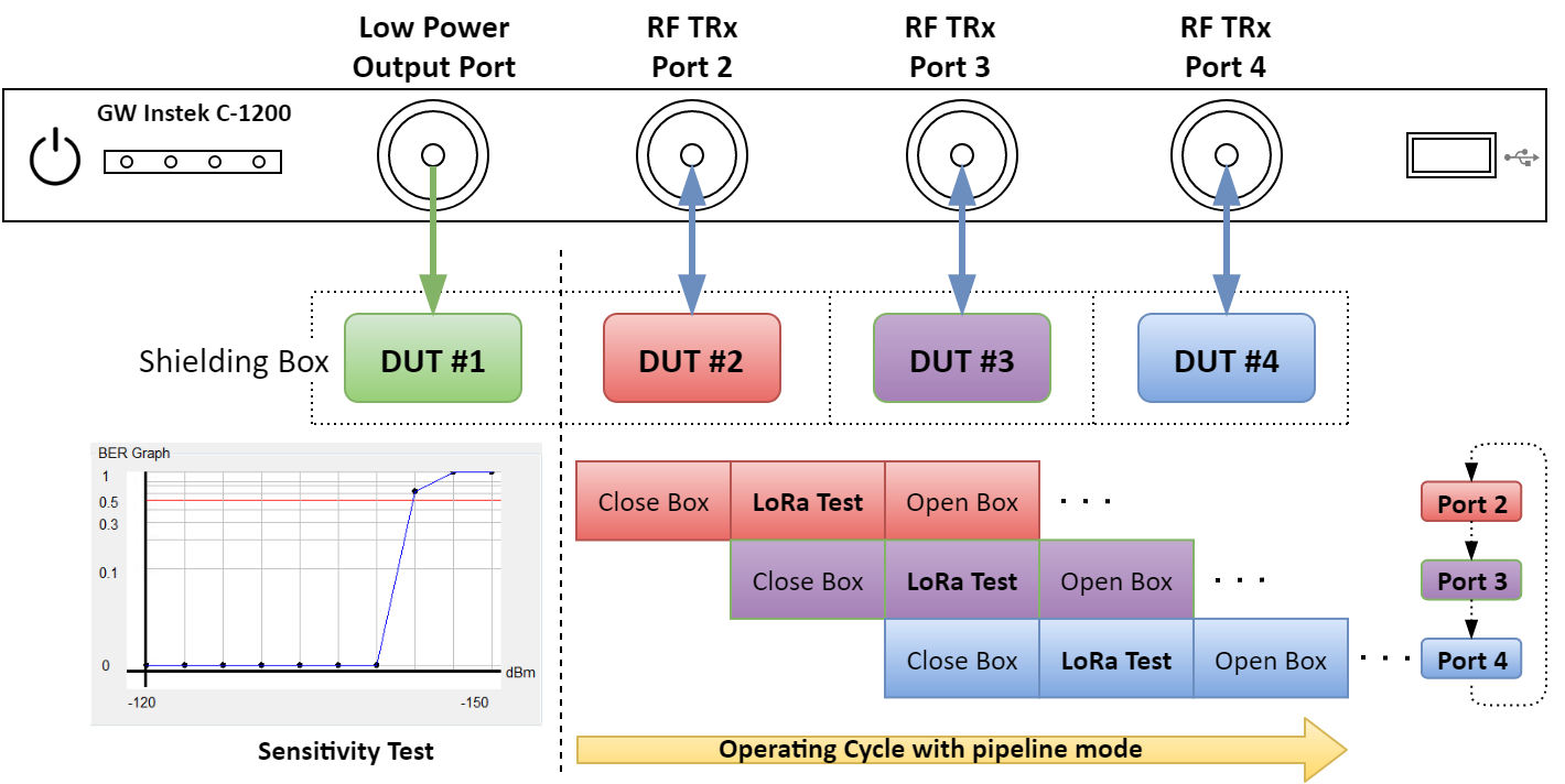 使用上將C-1200經由USB cable(C-1201標準配件)連接到C-1201,C-1201上有包含常用的控制總線UART、SPI 和I2C 等三種接口,根據LoRa device所使用的總線控制接口,將C-1201控制線接到LoRa device 的控制線。此時,可以在PC控制程序編輯LoRa device的控制指令,由C-1200經USB cable傳到C-1201,再透過控制總線直接控制LoRa device的動作。這樣的測試不經過LoRa信號的傳輸,而是在硬件上直接控制的NST,測試效率和速度都提升了, 可以提高產能。