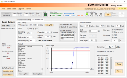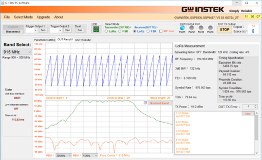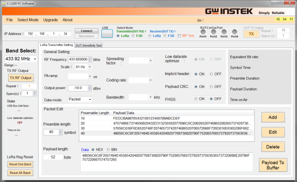 C-1200是一部綜合LoRa Tx和Rx 的OBT (One Box Tester)。在LoRa Transmitter方面,C-1200提供了Spectrum Analysis、Time Domain、FEI (Frequency Error Indicator)、和TOA (Time On Air) 等測試。在Receiver部分提供了 Sensitivity、BER(Bit Error Rate)、和PER(Packet Error Rate)等測試。除了Sub-GHz,C-1200也支持2.4 GHz頻段,以及FSK訊號測試。用戶也可以自行編輯傳送的Payload,接收資料時,可以透過binary和HEX呈現(xiàn)、和ASCII Code呈現(xiàn),使確認數據傳輸結果更容易。