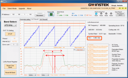 C-1200 的FEI (Frequency Error Indicator) 可以量到LoRa device工作頻率的誤差偏移量,藉此可以選擇適當的晶振 (crystal oscillator) 材料,并將頻率調校到準確的頻率點,以避免在實際應用時,因環(huán)境溫度變化造成頻率誤差變大,導致感度降低,甚至遺失封包的現(xiàn)象,提高LoRa device的通信可靠度。