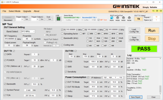 完整功能的專用測試應用軟件。C-1200提供完整功能的測試軟件,其使用接口風格接近Semtech公司的SDK (Software Development Kit),讓使用者很快就可以熟悉使用。除詳盡完整的Rx、Tx測試功能,還有MP (Mass Production) Test,只要勾選所要測試的參數設定即可進行大量反復性測試,如產線測試。在Spectrum Mode下可以進行美國FCC 15.209/15.247之通訊測試規(guī)范,確保產品符合歐美的通訊規(guī)范。如需進行功耗測試,僅需連接高精度電源供應器PPH-1503或者GDM-9061高精度電表,應用軟件即可開始測試。